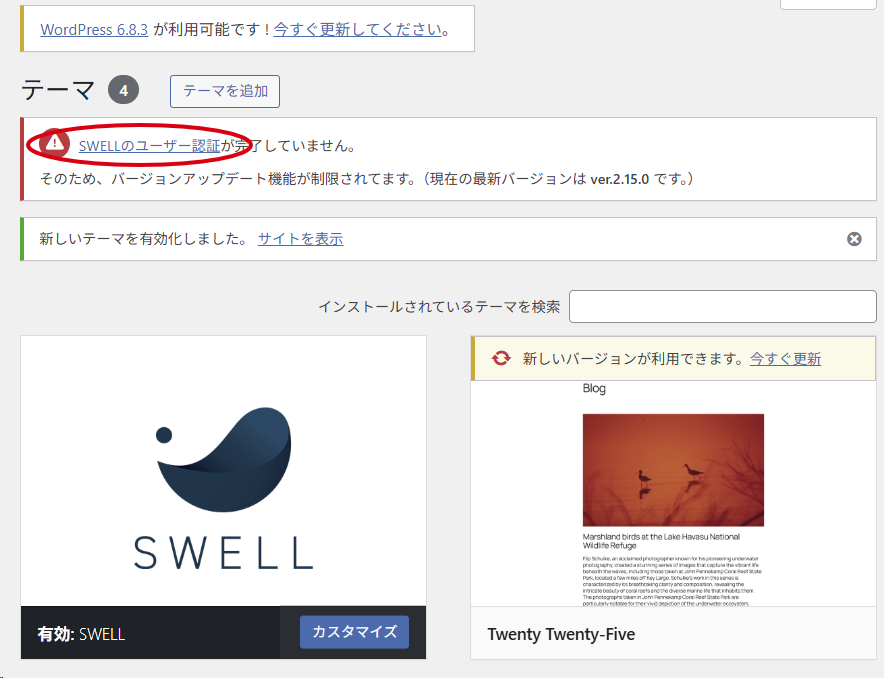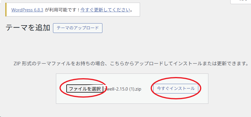 ファイルを選択でSWELLテーマファイルを選択してください。そうしたら今すぐインストール!そして有効化です