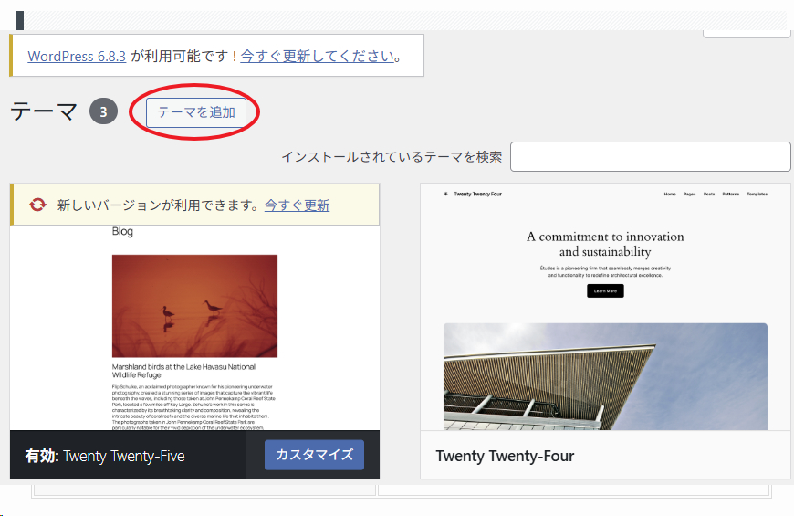 外観>テーマからこのページが開きます。そうしたらテーマを追加を押します。